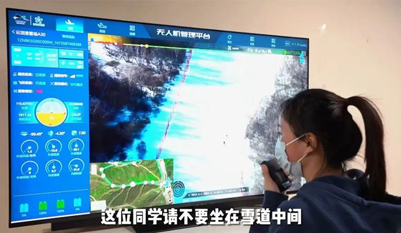“各位雪友注意啦,這里是高級道,前刃摔了廢屁股,后刃摔了廢胸……能不能滑心里有點數(shù)哦!”在云頂滑雪場指揮部里,電子屏幕上清晰顯示著由無人機實時回傳的景區(qū)人流量、秩序情況,安防人員通過無人機喊話維護(hù)現(xiàn)場秩序,提醒游客注意安全。