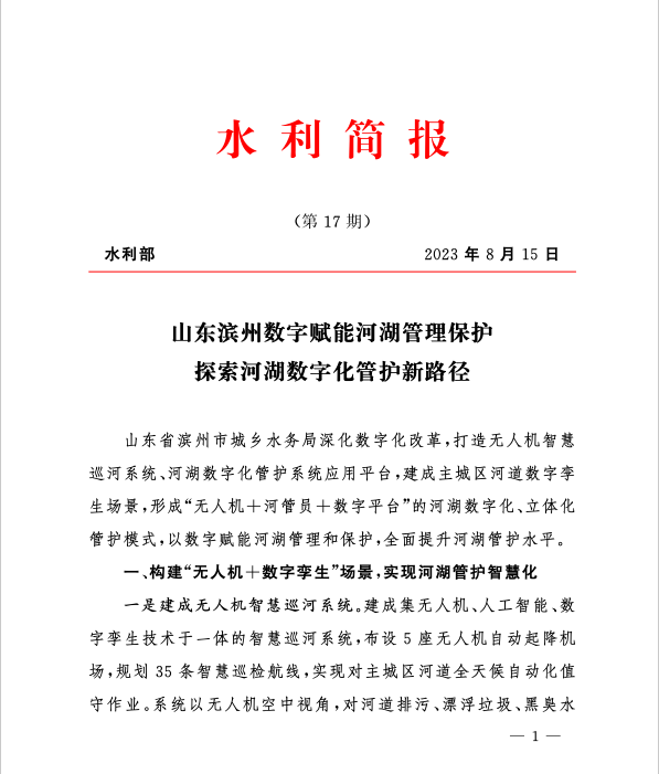 目前,無人機已累計巡查1000余架次,推送問題隱患300余處、形成巡河報告100余份,有力助推濱州健康美麗河湖管理水平。